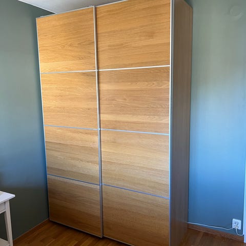 Säljer en stilren garderob i ljust trä med svarta handtag. Garderoben har flera hyllor, klädstänger och en utdragbar byxhängare – perfekt för ordning och översikt i kläderna.