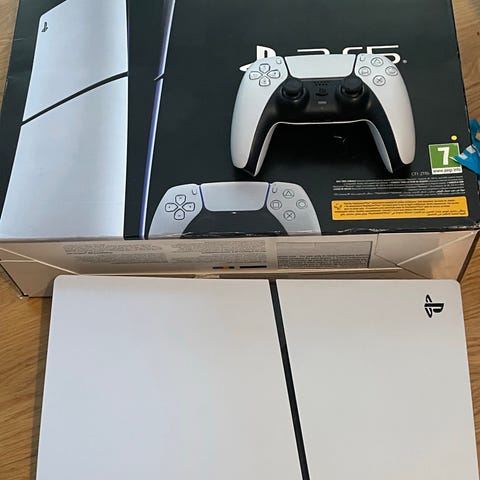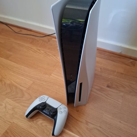 Sony Playstation 5 spelkonsol i vit färg. Konsolen på bilderna är diskversionen med skivläsare. Tillbehör som syns på bilderna inkluderar två DualSense-handkontroller, strömkabel, HDMI-kabel, USB-kabel samt konsolstativ. USB-c laddkabel