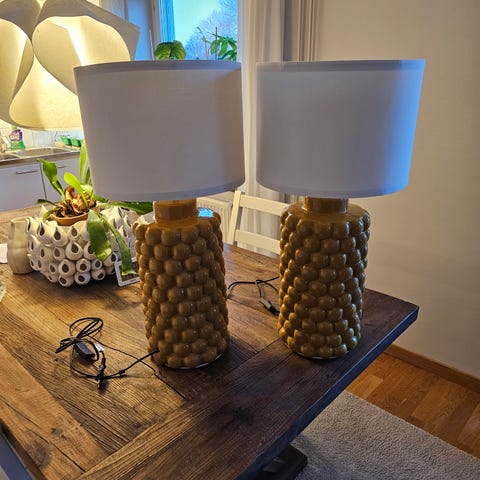 Hej. Säljer dessa helt underbara bordslampor Ines. Med plisserad linneskärm, måtten är följande. Höjd 34 cm. Skärmen är i måtten 14- 17 cm. Använd till denna lampa glödlampa e14 och 40 watt. Lamporna är jättesnygga. Mvh Marita Mikkola NYTT