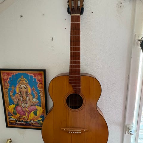 "Tranquillo Giannini Violão Para Concertista akustisk gitarr i naturträ. Klassisk nylonsträngad gitarr med helkropp i trä, ljus topp och mörkare sidor och baksida. Greppbräda med bandmarkeringar enligt standard för klassisk gitarr. Modellbeteckning och ursprung framgår av etiketten i ljudhålet: Violão Para Concertista, tillverkad i Brasilien. Passar för klassiskt spel, övning och allmänt akustiskt bruk."