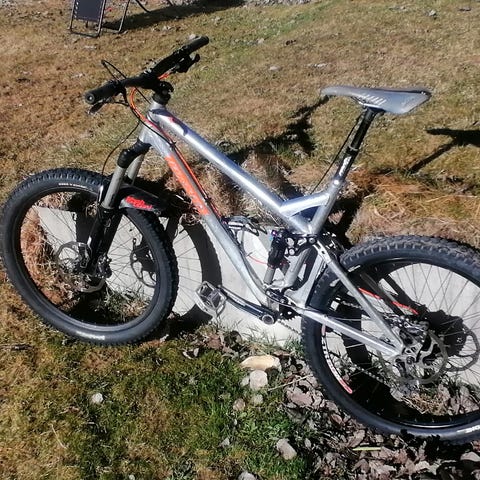 En tävlings cykel med Shimano xt utr och fox dämpare. 10.2 kg på en hel dämpad hoj med dessa componeter. Går att ställa både fram och bakdämp från styret. Mycket special utr som jag kan skicka bilder på. Thule pkt hållare(1495kr). Kul att använda men gubben börjar bli gammal och kan inte använda den till sin fulla potential. Dock väldigt lätt cyklad och jag har 7 cyklar till.