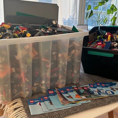 En superstor låda och en medelstor låda med lite över 20 kg Lego + 12 manualer! Lådorna är inte inräknade i vikten så vikten är rent lego.