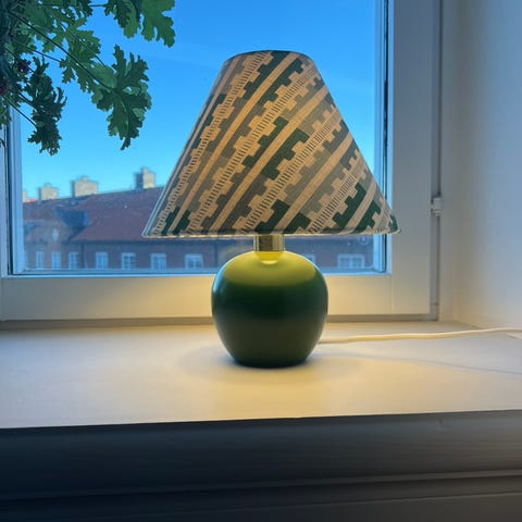 Säljer den här söta lilla lampan med skärm från Josef Frank/Svenskt tenn i tyget Tulpaner. Foten är i glas med en pigmentinfattning som är helt magisk.