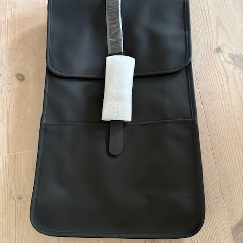 Svart Rains ryggsäck i fins skick. Mindre repor på hakarn. Vattentät. Laptopfickan passar en 13-tums bärbar dator med fodral.