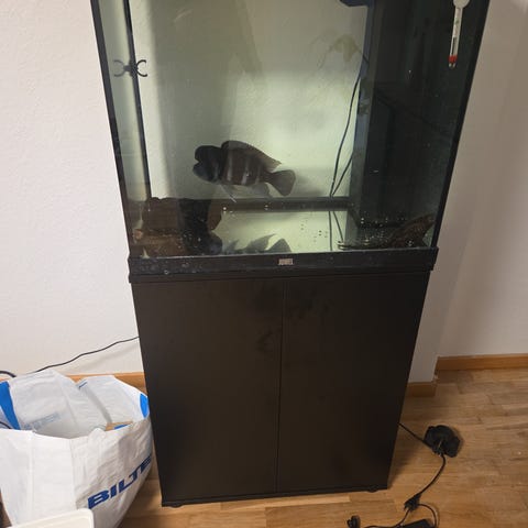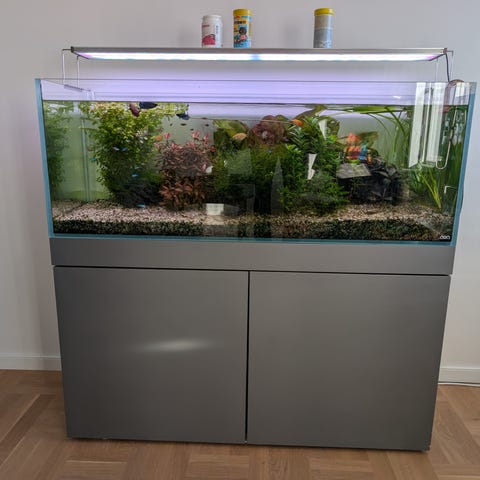 Akvarium 450l med underskåp i grått utförande. Akvariet är i glas och står på ett matchande skåp med tre dörrar för förvaring av tillbehör som pumpar, foder och rengöringsutrustning. Passar för sötvattensfiskar eller andra vattenlevande djur beroende på utrustning och inredning som används. Akvariet är avsett för inomhusbruk och placeras på plan yta, exempelvis i vardagsrum eller hobbyrum.