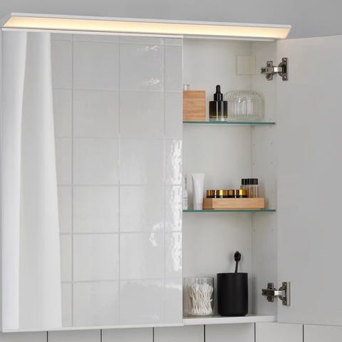 Spegelbadrumsskåp med väldigt bra förvaring.Skåpet består av flera spegeldörrar som öppnas utåt och döljer hyllplan för förvaring av badrumsartiklar. Invändigt finns flera öppna glashyllor i flera nivåer som ger god översikt. Utförande i spegelglas med metallbeslag, avsett för montering på vägg i badrum ovanför tvättställ.
