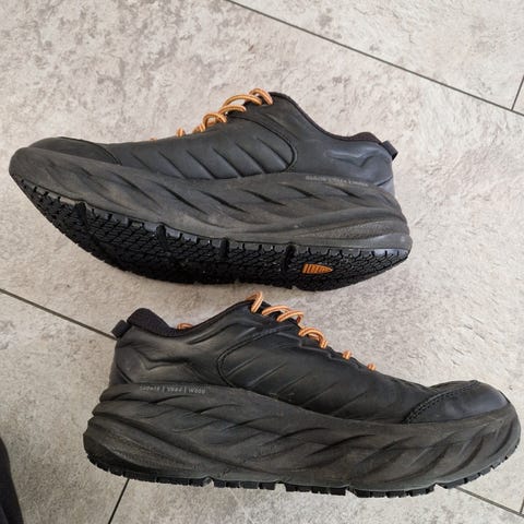 Helt oanvända Hoka OneOne M Bondi 7 Wide storlek 43 1/3 (9,5 USA, 9 UK). Bred läst (2E Wide). Modellen är svart med ovandel i textil/mesh och syntetdetaljer samt kraftig mellansula för dämpning. Yttersula i gummi med mönstrad undersida. Skorna är avsedda som sneakers/löparsko för herr och passar för vardagsanvändning eller träning på hårt underlag.