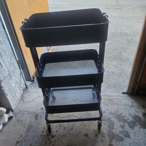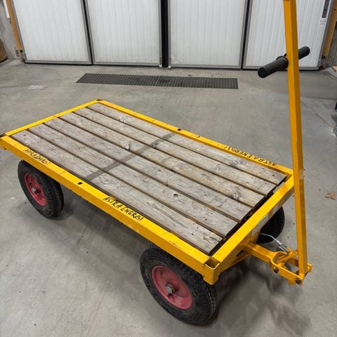 Hyllvagn i metall med flera hyllplan och stora hjul. Vagnen har öppna sidor och plana hyllor i mörkt material. Konstruktionen är anpassad för transport och förvaring av olika typer av gods, till exempel i lager, verkstad eller butik. Utrustad med hjul för enkel förflyttning på hårda underlag.