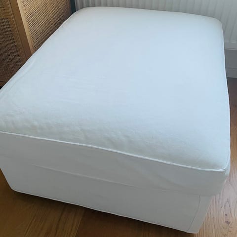 Säljer en stabil och bekväm IKEA‑fotpall i bra skick. Pallen är hel och stadig, och medföljer gör dessutom helt nya, oanvända överdrag i samma ljusa tyg som på bilden.