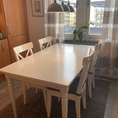 Vi säljer Strandtorp matbord från IKEA, inköpt för 2,5 år sedan. Nypris 5995 kr. Minsta längd är 150 cm, med en iläggskiva (på bilden är en iläggskiva ilagd) är längden 205 cm, med två iläggskivor är längden 260 cm. I flytt blev det några märken/skrap som vi fixat till med lite bets, se närbilder. Betalning sker via Swish och köparen tar med egen bärhjälp.