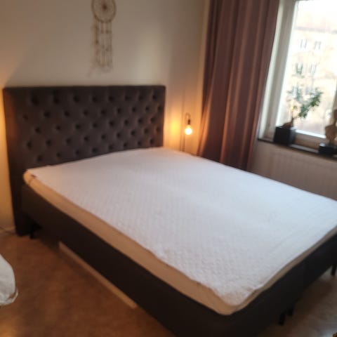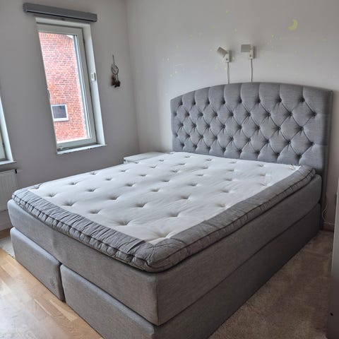 Mio kontinentalsäng i grått tyg. Sängen består av underdel med resårbotten och övre madrassdel. Hög, stoppad huvudgavel i matchande grått tyg med knapptuftad design. Passar som dubbelsäng i sovrum och ger en sammanhållen, textil helhet mot vägg eller gardin bakom sängen. Lämplig för två personer beroende på mått och madrassernas hårdhet.