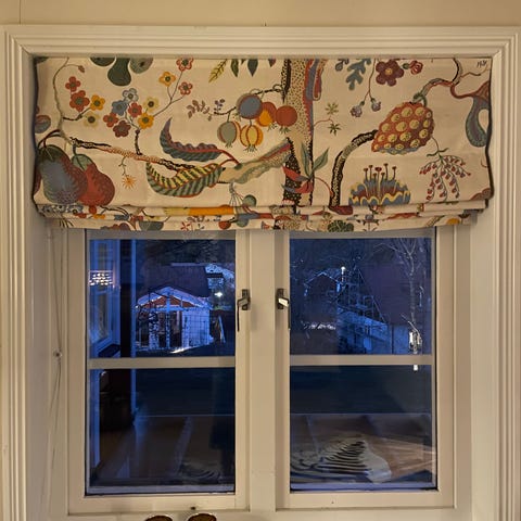 hissgardin i textil av märket Harlequin med flerfärgat mönster i beige och bruna toner. Passar för montering ovanför fönster och kan dras upp och ned med sidodrag. Lämplig som sol- och insynsskydd i exempelvis vardagsrum, sovrum eller arbetsrum.