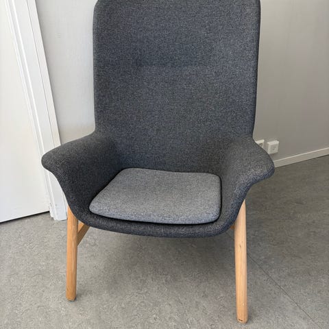 Ikea Vedbo fåtölj med hög rygg. En mycket skön fåtölj, kan sitta hur länge som helst i den. Rymlig men ger ett lätt intryck i rummet. Ofta använd på kontor då den funkar även i exempelvis en mötes-kontext. Köpte den ny för ca två år sedan och haft ett bomullstäcke på den, så den är därför helt fräsch. Säljer den då jag eventuellt behöver en något mindre fåtölj. Rök- och djurfritt hem. Nypris: 2995 kr så ett riktigt fynd!