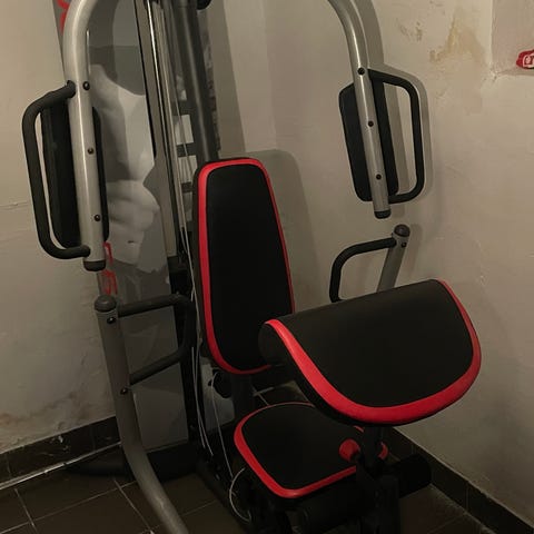 Ett gym för hemmabruk bland annat roddmaskin, magtränare, skivstång m.m.