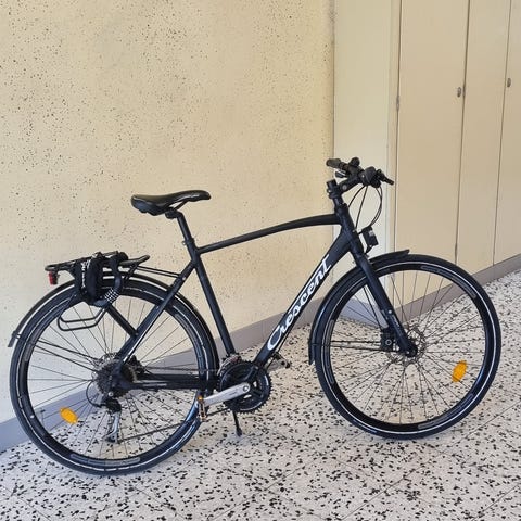 Säljer min frus Crescent Åkulla hybridcykel. Den har hydrauliska bromsar fram och bak, 24 växlar och 28-tums hjul. Framgaffeln är dämpad och går att justera hur hård/mjuk man vill ha den.