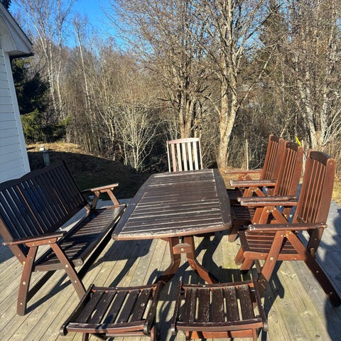Trädgårdsmöbelset med ett åttakantigt bord i trä och flera matchande stolar i trä. Bordet har hål i mitten för parasoll. Möblerna är avsedda för utomhusbruk, till exempel uteplats, altan eller trädgård. Träkonstruktionen ger en stabil sitt- och bordsyta och kan vid behov oljas eller behandlas efter önskemål.