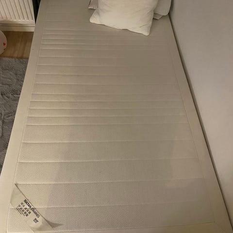 Ikea säng, Skotterud, med bäddmadrass i vit färg. Enklare enkelsäng med vadderad bäddmadrass. Passar som säng i sovrum, gästrum eller studentboende. Neutralt utförande som är lätt att kombinera med annan inredning. Inköpt 30/7-25. Utan ben. Katt finns i hemmet.