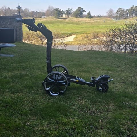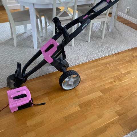 Go Kart Electric Golf eldriven golfvagn med litium golfvagnsbatteri LiFePO4 12V 42Ah. Vagnen är hopfällbar och har två större hjul bak samt ett mindre framhjul. Batteriet sitter i separat batterilåda. På bilderna syns detaljer på hjulinfästning men inget som påverkar vagnen. Hjulet sitter fast.