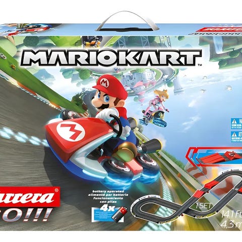 Super Mario Mario Kart bilbana Carrera GO. Bilbaneset med Mario Kart-tema där bilarna körs på en elektrisk racerbana. Passar för barn som tycker om Super Mario och bilbanor. Innehåller bana och 2 fordon ( 1 av de fungerar så där och skulle behöva byta).