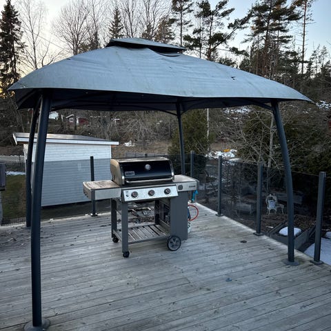 Hammock trädgårdsgunga i grå färg med matchande sitt- och ryggdynor. Utrustad med tak som ger skugga. Passar för placering på balkong, altan eller i trädgård som sittplats för avkoppling utomhus för de mindre individerna :)