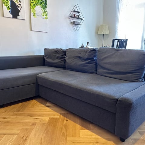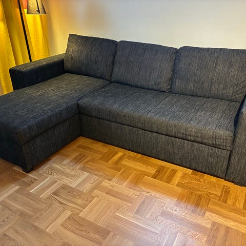 Bekväm och praktisk bäddsoffa med divan, maximalt djup: 154 cm. Använd men mkt gott skick. Har funnits hund i hemmet men aldrig legat i soffan. Gott om förvaring för täcken eller annat. Finns fläckar på bäddmadrass. Bäddmått: 142 * 210 cm.