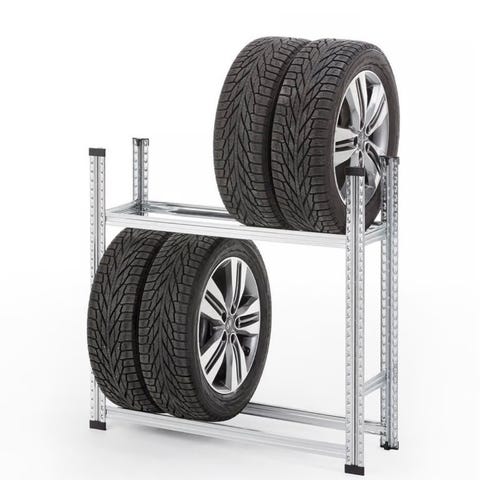 Däckställ med fyra hyllplan för förvaring av däck. Stället är utrustat med hjul för enkel förflyttning.