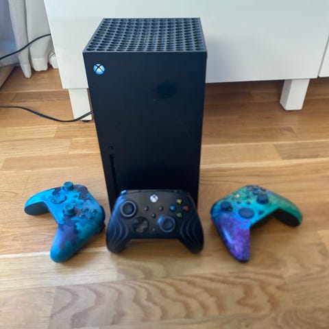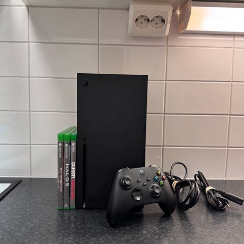 Ett fint Xbox series X 1TB i mycket fint skick som tyvärr inte används längre. Allting fungerar som det ska och alla kablar som behövs ingår! Två trådlösa handkontroller i bra skick ingår även i priset.