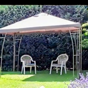 Åttakantig paviljong i trä med glaspartier runtom. Ytterpanel i målat trä och invändig klädsel i omålat trä. Paviljongen har dubbeldörr i trä med glasrutor och sadeltak med mörk takbeläggning. Invändigt finns trägolv och tak med synliga takbjälkar samt en takkrok/armaturfäste i mitten. Lämplig som trädgårdspaviljong eller lusthus för uteplats eller trädgård. Hämtning och förflyttning får ni ordna själva!