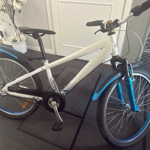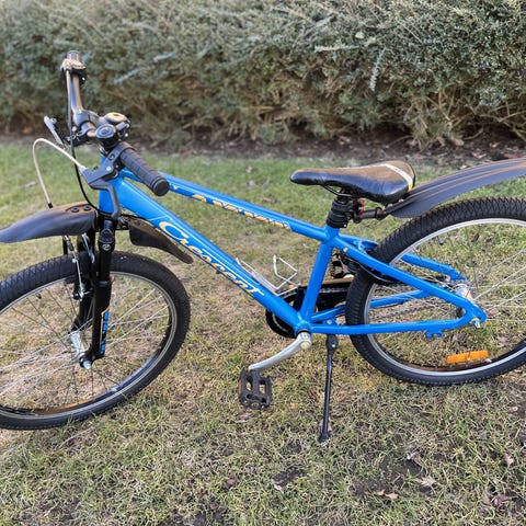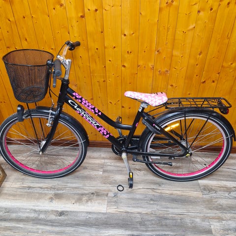 Barncykel med 24" hjul i blå färg. Cykeln har raka styren, sadel med reflexdetaljer samt skärmar fram och bak. Utrustad med fotstöd och reflexer på hjul och pedaler. Passar barn som behöver en cykel i storlek 24" för vardagscykling och fritidsbruk.