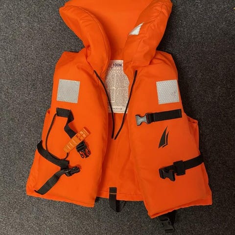 Flytväst i orange färg. Utrustad med krage och reflexdetaljer för ökad synlighet. Spännen och justerbara remmar för att kunna anpassas efter bäraren.