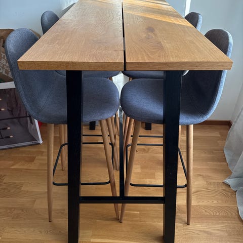 Vitt barbord med måtten 130 cm långt, 69 cm brett och 105 cm högt. Två vita barstolar ingår