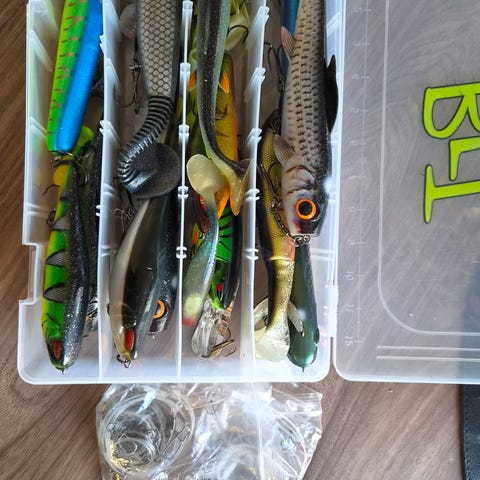 Säljer en uppsättning med Gäddrag då de ej används längre 19st, en krokurtagare+ sevenger hink.