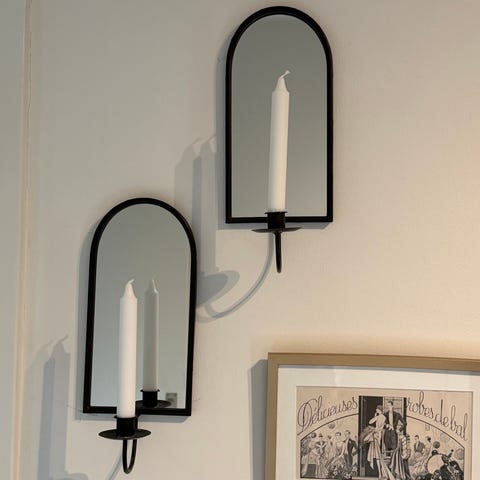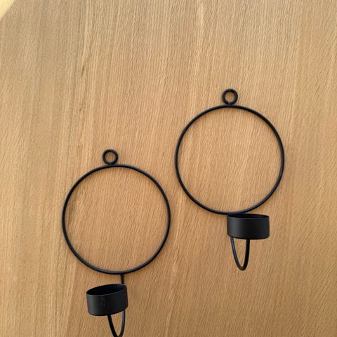 Säljer två matchande ljushållare för väggmontering som ger ett fantastiskt lyft åt rummet. De har en modern, minimalistisk design med svarta metallstänger som ramar in en rund spegel. När värmeljusen är tända skapas en mycket fin reflektion i glaset.