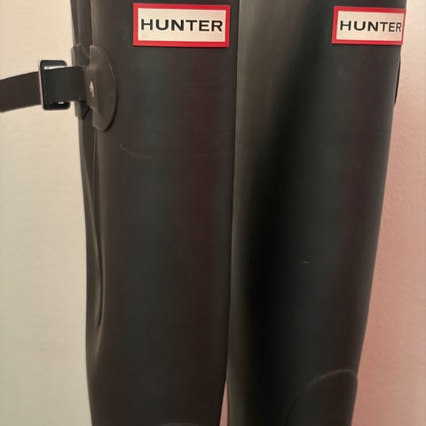 Rejäla Hunter gummistövlar i storlek 38. Modellen är unisex och har högt skaft med justerbart spänne upptill. Stövlarna är tillverkade i gummi och har en grovmönstrad sula för bättre grepp. Färg: grön med röd kant upptill. Passar för användning i regn och till skogspromenader.