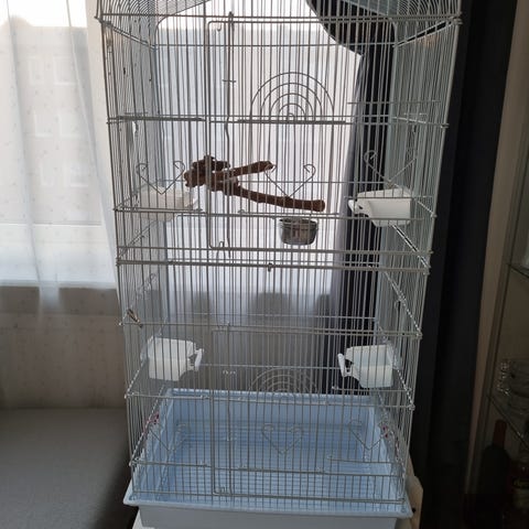Fågelburar i metall med plastbotten i vit och blå färg. En större bur står på stativ med hjul och flera mindre burar är väggmonterade. Burarna har gallerkonstruktion, öppningar framtill samt sittpinnar inuti. Lämpliga för mindre burfåglar som exempelvis undulater eller kanariefåglar. Passar för inomhusbruk.