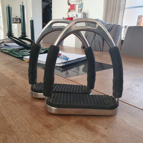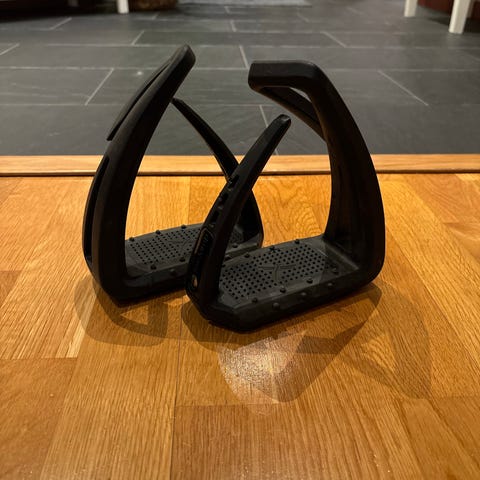Ett par ophena stigbyglar magnetiska S pro, enbart provade en gång, så i stort sätt oanvända. Designen är väldigt säker för ryttaren då stigbygeln sitter fast i magneten i en sula så att du inte tappar stigbygeln, men om du ramlar av så håller inte magneten kvar, så du har väldigt liten chans att fastna i stigbygeln eftersom att den är helt öppen på yttersidan