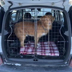 Trixie hundgaller för bil, justerbart i bredd 96–163 cm och höjd 34–48 cm. Monteras i bagageutrymmet för att avgränsa lastutrymmet mot kupén. Tillverkat i metall med flera horisontella stag och justerbara fästen för anpassning till olika bilmodeller. Avsett för transport av hund eller annan last i bilens bagageutrymme.