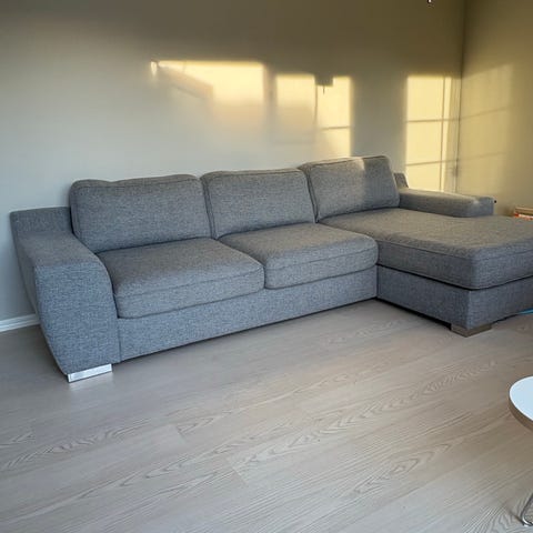 Mått: bredd 285cm. Djup 85/170. Höjd 60(ryggstöd.)Väl använd soffa, se bilder för skick. Liten del av trät under soffan har gått sönder(inget som stör funktionen. Ses ej om man inte tittar noga). Dynorna är lite nedsuttna på kanterna. Finns säkerligen en del fläckar. Har ej rengjort soffan och kommer inte göra det. Därav priset. Först till kvarn. Gärna hämtning omgående.