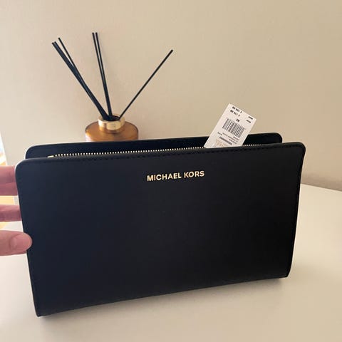 Säljer en stilren Michael Kors Hamilton väska i svart läder tillsammans med matchande plånbok. Väskan har tre fack varav ett med dragkedja samt avtagbar axelrem. Klassisk modell med guldfärgade detaljer och dekorativt lås.