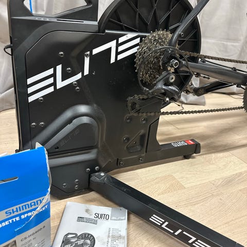 Bakhjulet monteras i trainern för inomhusträning på vanlig cykel.