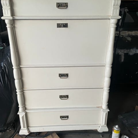 Vit smal byrå (vitmålad furu tror jag) med 6 lådor. En av lådfronterna har en tendens att bli lös. Men det löser den händige enkelt.