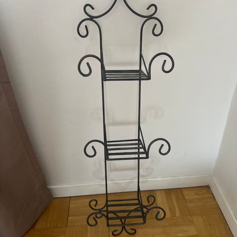 Hylla i svart metall med ett hyllplan i glas och flera krokar nederst. Öppen stomme med dekorativt mönster upptill. Passar till förvaring och upphängning av exempelvis handdukar, köksredskap eller accessoarer i hall, badrum eller kök.