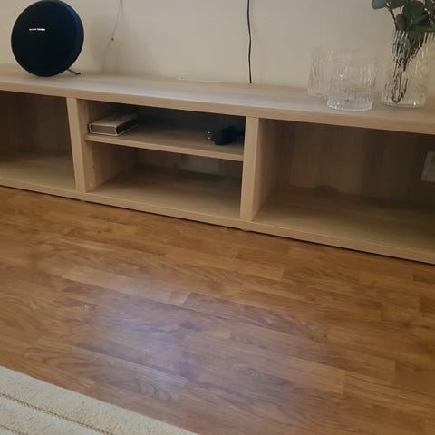 3 st vägghängda skåp från IKEA. Använda som tv bänk därför finns det färdiga hål för kablar i mittenskåpet & redo att sättas upp under tv.