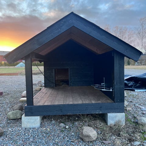 Hundgård för utomhusbruk med nätsektioner i metall. Inhägnaden är anpassad för hundar eller andra mindre djur som behöver en avgränsad yta utomhus. Konstruktionen består av flera sektioner med stängsel och grind, vilket ger möjlighet att skapa en större eller mindre yta beroende på behov. Passar för placering i trädgård eller på tomt där man vill ha en tydlig och säker inhägnad.