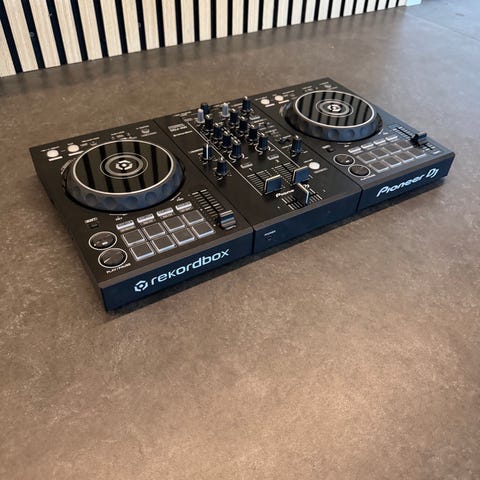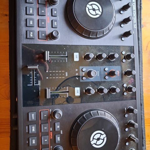 Numark Party Mix Live DJ‑kontroller i svart utförande. Kontrollenheten har två joghjul, inbyggda högtalare och mixersektion med volym- och EQ‑reglar. Utrustad med cue‑knappar, loop‑ och effektkontroller samt pitchfadrar för varje kanal. På bilderna syns även medföljande nätadapter, anslutningskabel och USB‑hub/adapter. Passar för digital DJ‑mixning tillsammans med kompatibel dator eller annan enhet via USB‑anslutning.