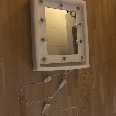 Sminkspegel med belysning i vit ram. Rektangulär spegel med integrerade lampor runt kanterna och strömkabel med adapter. Spegeln har stödben på baksidan för fristående placering samt fästen för eventuell väggmontering. Lämplig som sminkspegel eller allmän spegel i sovrum, hall eller badrum där eluttag finns i närheten.