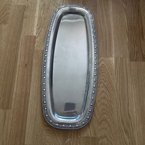 Säljer en stilren och dekorativ kvadratisk bricka i silverfärgad metall. Brickan har en vacker mönstrad kant (gadroon-kant) och en borstad yta i mitten, vilket ger den en både klassisk och modern känsla.