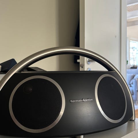 Harman Kardon Go + Play bärbar högtalare i vit färg. Trådlös högtalare med integrerat bärhandtag som gör den enkel att flytta mellan olika rum eller ta med sig. Passar för uppspelning av musik, poddar och annat ljud från kompatibla enheter via trådlös anslutning eller tillgängliga anslutningar beroende på modell. Designad för hemmabruk eller mobil användning där man önskar fylligt ljud i ett kompakt format.