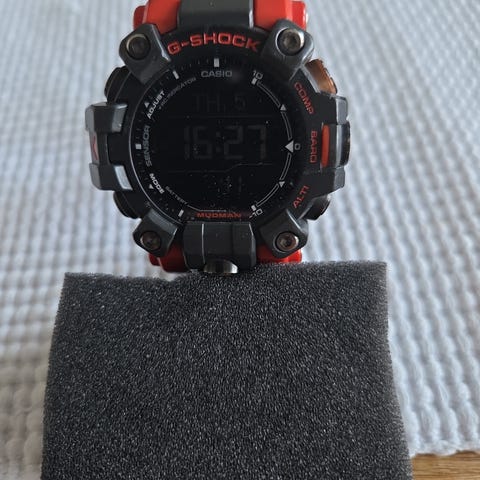 Casio G-Shock herrklocka med analog och digital visning. Boett i svart med grön kamouflageinspirerad bezel och tydliga indexmarkeringar. Klockan har funktioner som datumvisning, stoppur och belysning, samt knappar för läge, start och ljus runt boetten. Levereras med originalförpackning och dokumentation med modulnummer 5611, vilket anger urverkets typ och funktioner. Passar som robust vardagsklocka för man.