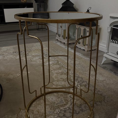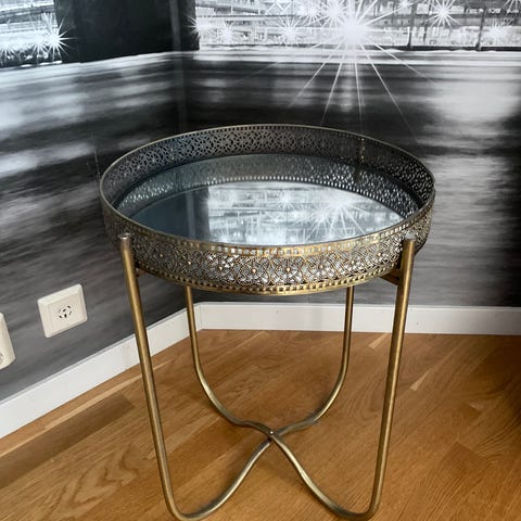 Ett mordent men rustikt sidebord, piedestal eller prydnad top i spegelglas och som en ”stål bur” nertill.